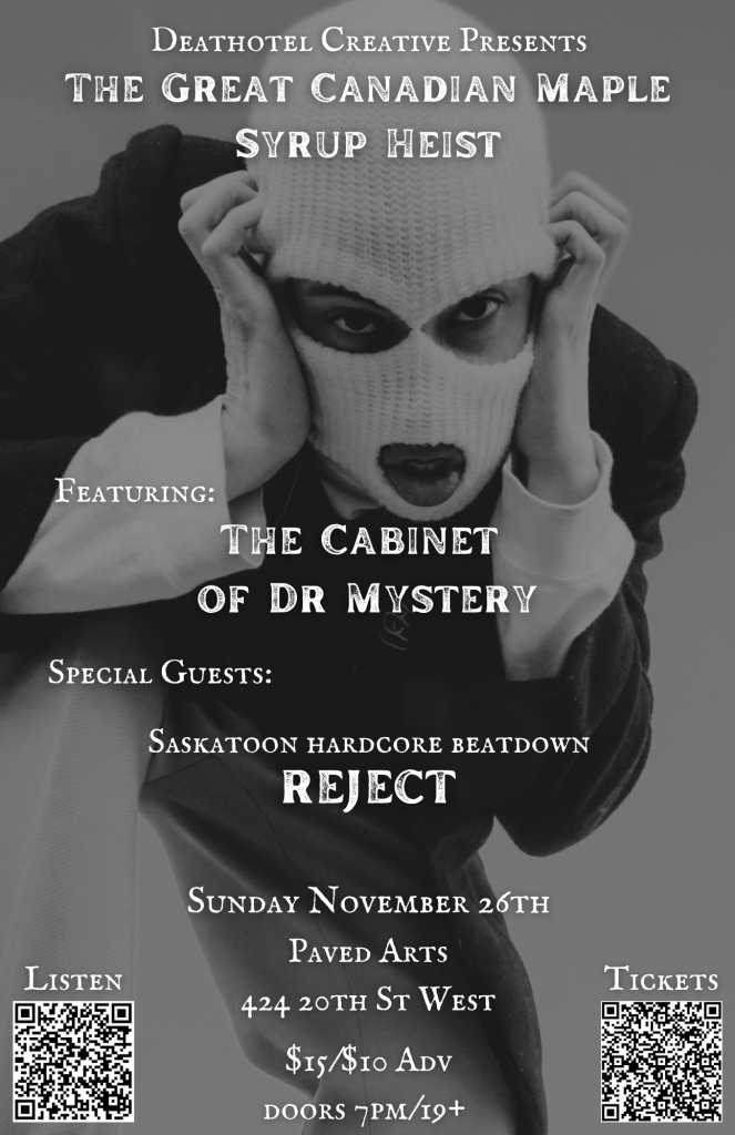 The Cabinet of Dr Mystery’s first live show. Your hosts take you on a sticky journey through Canada’s largest maple syrup heist. In 2012 it was discovered that nearly 3,000 tonnes of maple syrup, worth almost $19 million had been stolen from Quebec’s federal maple syrup reserve.